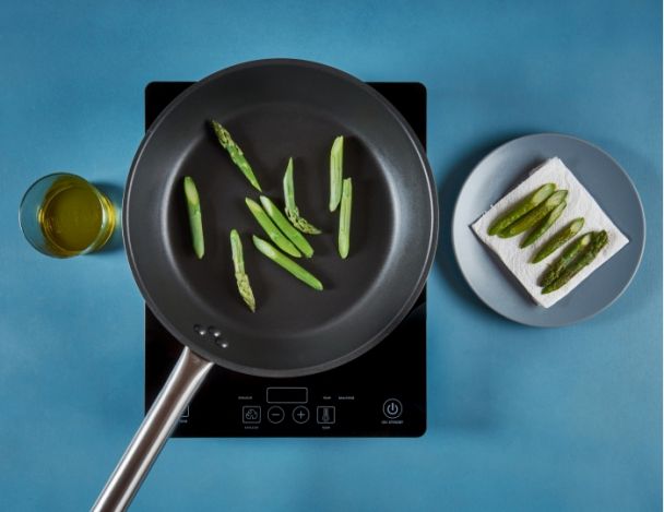 Pendant la cuisson des quasis au four, poêler les asperges à l'huile d'olive
