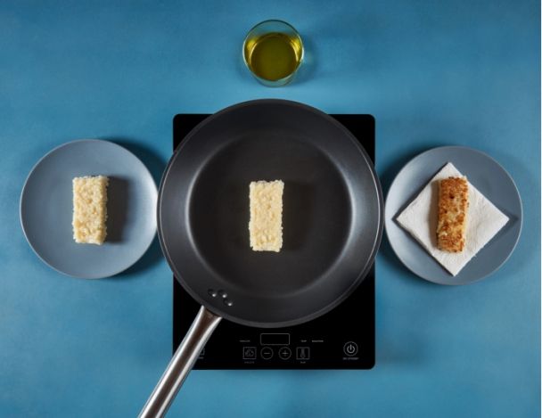 Une fois son temps de repos effectué, tailler des bandes de 8 à 10cm de longueur et poêler sur une face à l'huile d'olive
