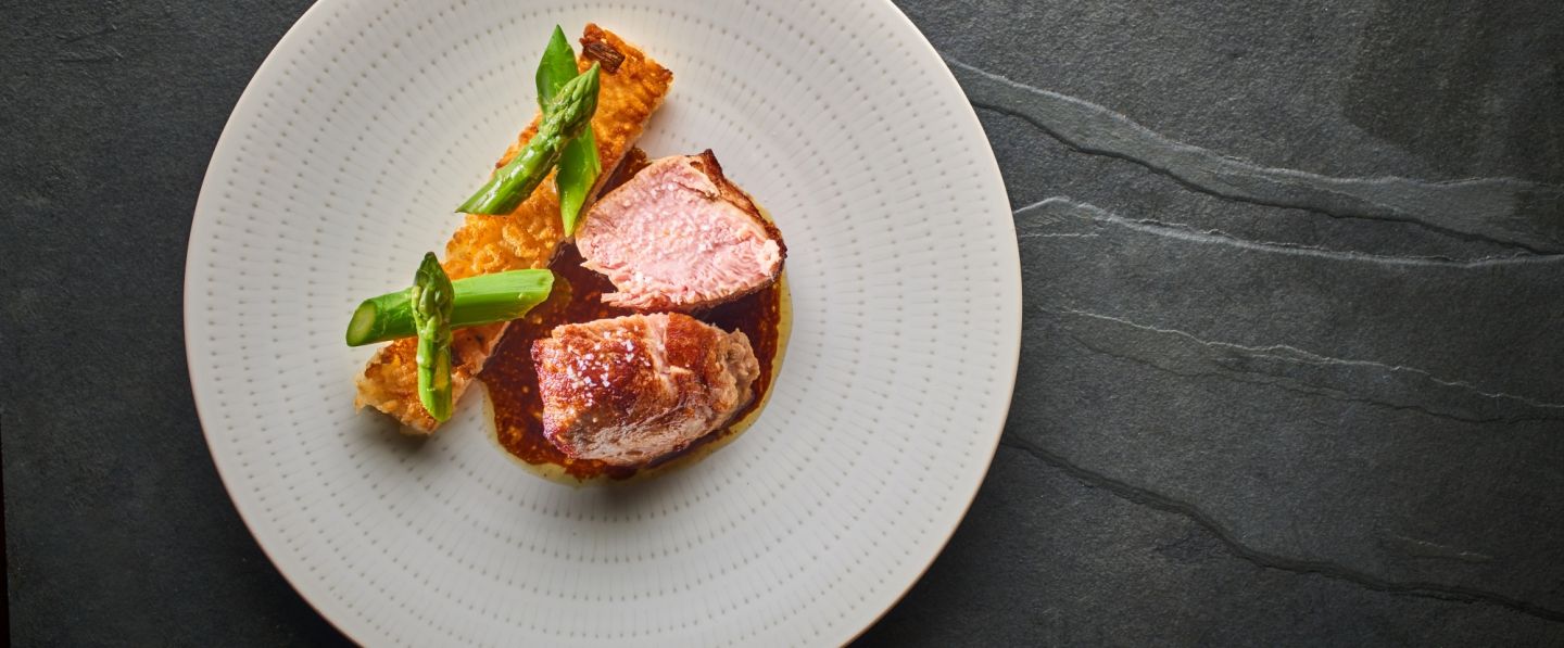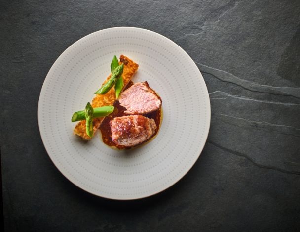 Déposer une bande de risotto croustillant sur le côté de l’assiette, 2 asperges par-dessus. Verser un peu de jus et surmonter d’un quasi de veau coupé en 2.