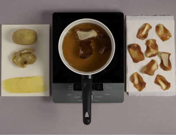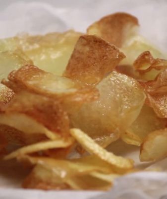 Faire des chips de pommes de terres à l'aide d'une mandoline. Et les faire frire dans une friteuse à 160°C. Egoutter et saler.