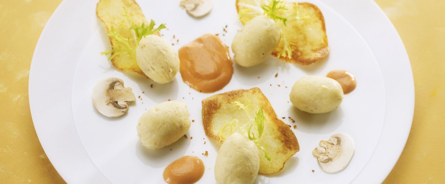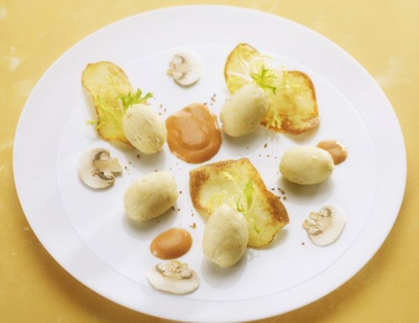 Surmonter les petits quenelles d'une belle chips et la frisée. Puis décorer avec des champignons de paris en batonnets et utiliser l'intérieur du champignon pour parfumer le plat.