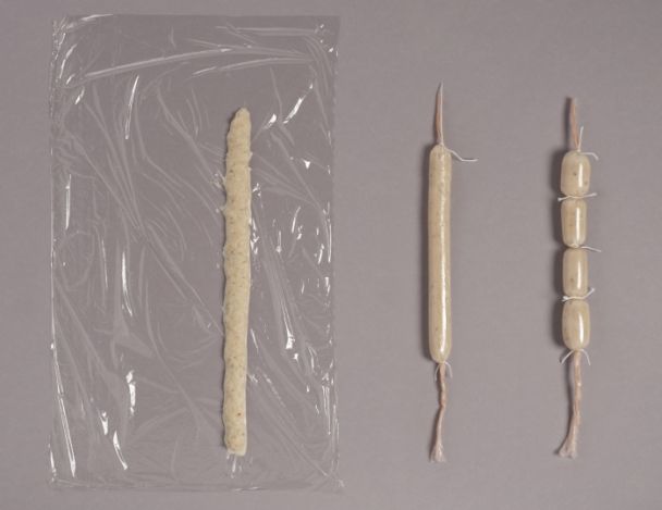 Etirer le film vers vous,étaler une bande de farce sur le papier film puis rouler sur elle-même de façon à faire un beau tube. Sectionner en petits boudins à l'aide d'une ficelle en l'attachant tous les 3cm.