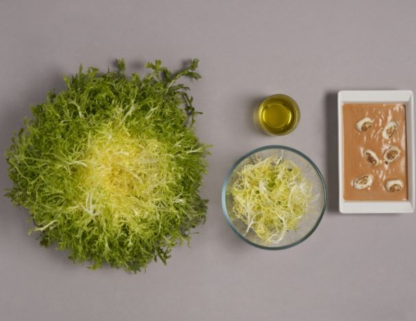 Trier la salade frisée, préparer uniquement le jeune de la salade. Assaisonner d'huile d'olive, sel et poivre.
