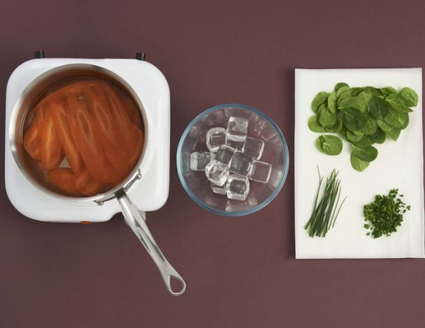 Couper la carotte en fines lamelles et blanchir ces dernières 10 secondes dans une casserole d'eau bouillante salée, les plonger aussitôt dans de l'eau ; contenant des glaçons puis les égoutter. Laver et équeuter les pousses d'épinards. Récupérer les pointes de ciboulette et ciseler le reste.