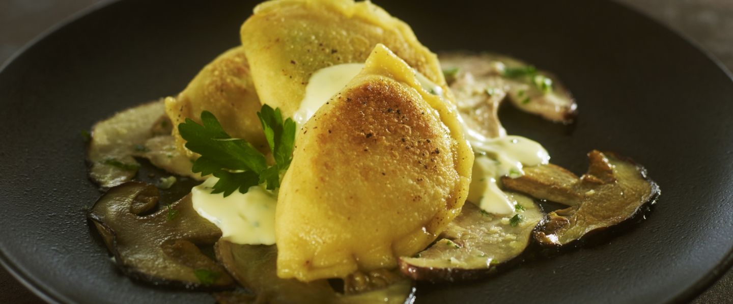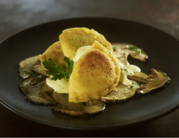 Cuire les ravioles à l'anglaise, puis les faire sauter avec de l'huile d'olive et 20g de beurre. Disposer la fricassé de cèpes poêlés ainsi que les cèpes grillés dans l'assiette, puis les ravioles par-dessus.