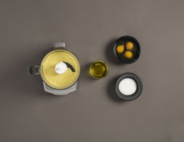Mettre dans un robot la semoule de blé dur, les 6 oeufs entiers, 2 cuillères à soupe d'huile d'olive et 5g de sel. Mélanger le tout jusqu'à obtention d'une pâte homogène. Réserver au réfrigérateur pendant 12h minimum. Abaisser la pâte puis réserver de nouveau.
