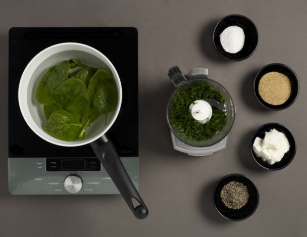 Eplucher, laver et cuire à l'anglaise les épinards. Les refroidir dans de l'eau froide après cuisson et bien les presser. Passer ensuite les épinards au mixeur et y incorporer la chapelure, la ricotta, du sel et du poivre.