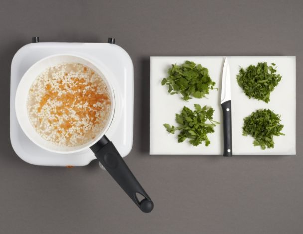 DifficileÉplucher et laver les carottes ainsi que le céleri boule et les détailler en brunoise de légumes. Cuire la brunoise « à l’anglaise » dans 50cl d’eau bouillante salée de manière à ce qu’elle reste croquante. Hacher le persil et la coriandre. Réserver au frais.