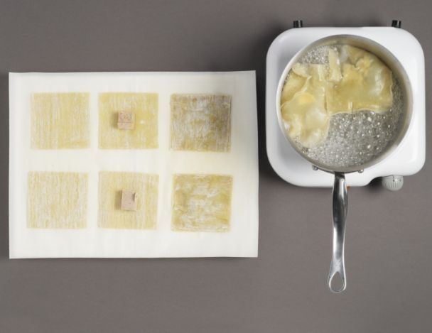 Couper le foie gras de canard en cubes d’environ 1 cm de côté (environ 15 g). Disposer 8 feuilles de raviole, placer un cube de foie de canard frais au centre de la feuille. Saler et poivrer et fermer les ravioles avec les 8 autres feuilles en les badigeonnant de jaune d’œuf à l’aide d’un pinceau. Pocher les ravioles environ 5 min dans de l’eau bouillante salée.