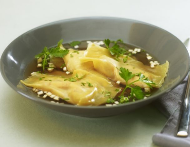 Disposer les ravioles dans une assiette creuse ainsi que la brunoise de carotte et de céleri, napper de consommé de bœuf bouillant et agrémenter de persil et de coriandre hachés.