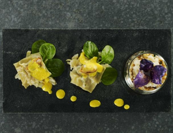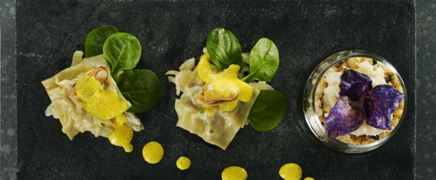 Une fois les ravioles cuites, les égoutter et les déposer joliment sur l’oignon puis surmonter de quelques pousses de tétragones et d’une moule. Disposer sur le dessus l’émulsion au safran. Dans le bol de la pressée, mettre le crémeux de pommes de terre et planter dessus quelques chips.