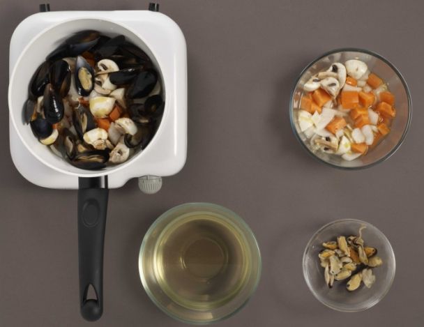 DifficileTailler les carottes, oignons, ail et champignons. Les mettre à revenir dans une grande casserole avec de l’huile d’olive, y déposer les moules préalablement rincées et ébarbées, puis déglacer au vin blanc et cuire à couvert quelques minutes. Une fois ouvertes, séparer le jus des moules avec la garniture aromatique et réserver les jus avec la garniture au frais. Décortiquer les moules et réserver.