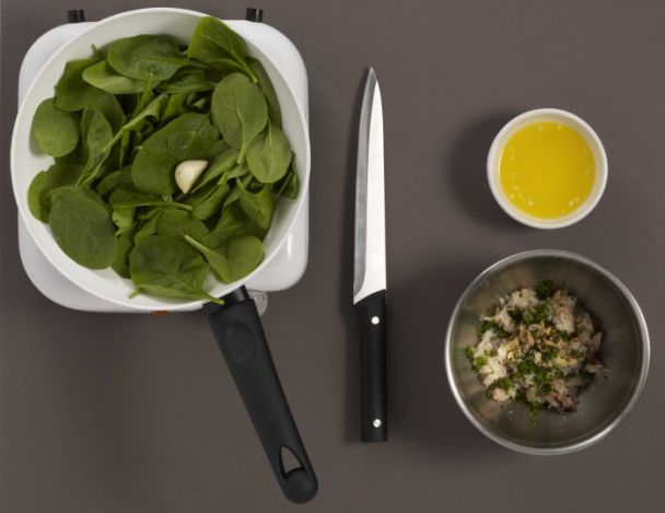 Faire réduire 200g de beurre et verser la réduction sur la chair. Faire tomber dans une casserole avec une cuillère à soupe d’huile d’olive et un grain d’ail, 450 g de tétragones(pousse épinard) avec une pointe de sel.
