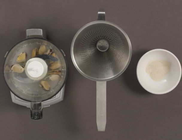 Prendre 150 gr de jus de moules avec 75 gr de moules, mixer le tout longuement, passer au chinois fin puis incorporer les 2 gr d’agar et faire chauffer jusqu’à 80°C puis verser 4 bols appropriés pour le dressage. Réserver au frais.