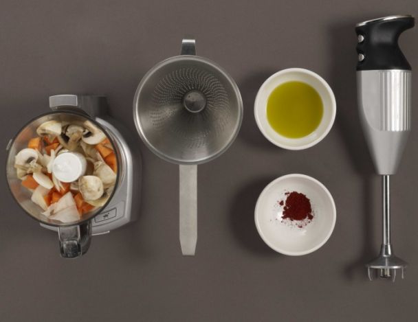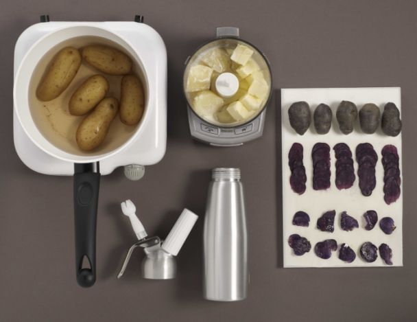 Une fois cuites, les éplucher à chaud, mettre 50 gr de pulpe avec 50 gr de crème, 50 gr de beurre et 25 gr d’eau. Mixer le tout de façon à obtenir une texture lisse. Verser l’appareil dans le siphon et charger deux cartouches de gaz. Réserver le siphon dans une casserole d’eau tiède.