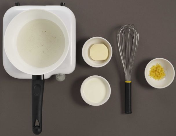 Monter énergiquement avec un fouet afin d’avoir un bouillon épais. Puis incorporer un zeste de citron râpé très fin. Réserver dans une casserole.