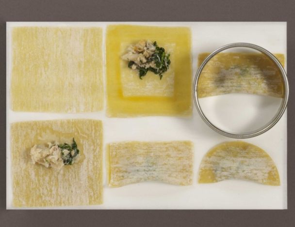 Casser et battre les œufs, étaler les feuilles à ravioles et déposer sur un côté l’appareil, passer à l’aide d’un pinceau l’œuf battu sur tous les bords de la feuille et replier. Puis détailler avec l’emporte-pièce de façon à obtenir un petit coussinet. Reproduire l’opération afin d’obtenir 5 ravioles par personne et réserver au frais.