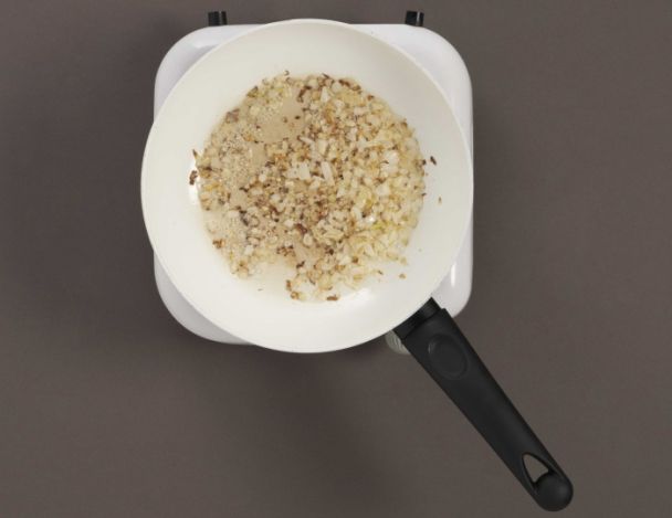 Plonger les ravioles dans une eau bouillante. Pendant le temps de cuisson, disposer 5 petits tas d’oignon dans une assiette creuse, puis poêler légèrement la tétragone restante.