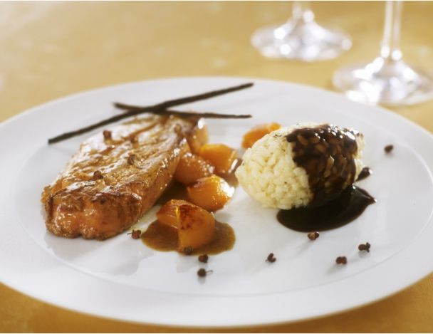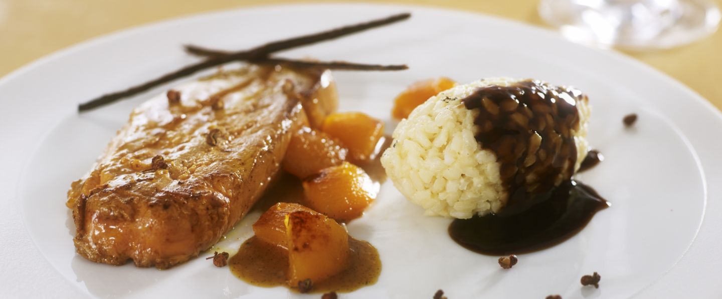 Réchauffer les sauces, les abricots, et le foie gras. Dresser une quenelle de risotto au milieu de l'assiette, placer le foie gras assaisonné de Sichuan, les abricots, une demi gousse de vanille, et mettre autour les sauces. Servir aussitôt.