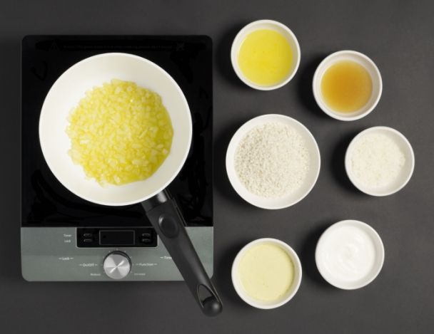 Ciseler l'oignon, le faire suer sans coloration avec de l'huile d'olive. Ajouter le riz, déglacer au vin blanc.