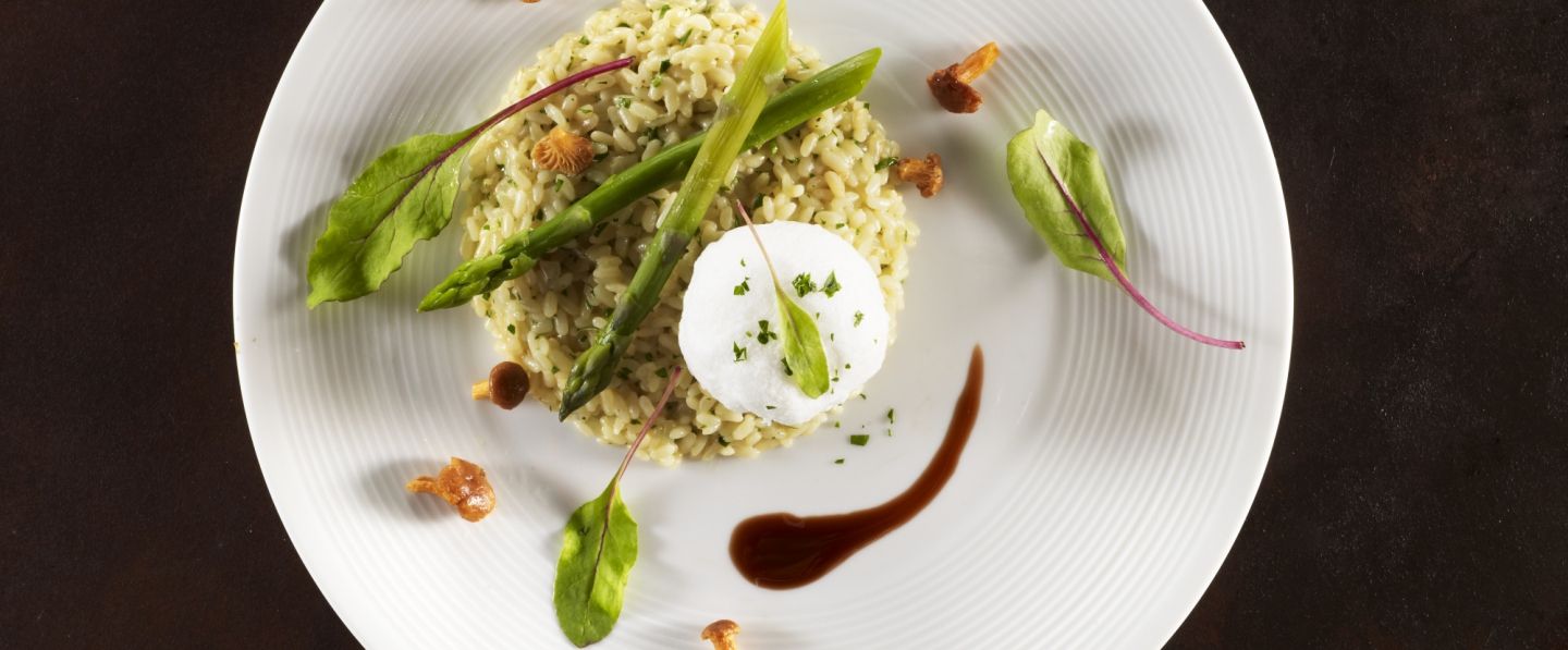 Dresser le risotto bien crémeux sur assiette, ajouter les girolles, les asperges, les herbes et un peu d’écume de beurre noisette. Finir avec le jus à la sarriette.