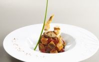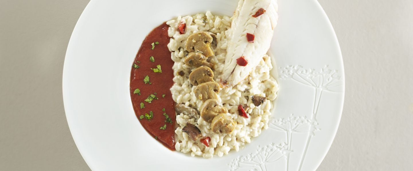 Dresser le risotto en assiette, poser le filet de rouget dessus et décorer de coulis de poivron.