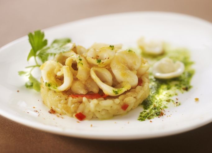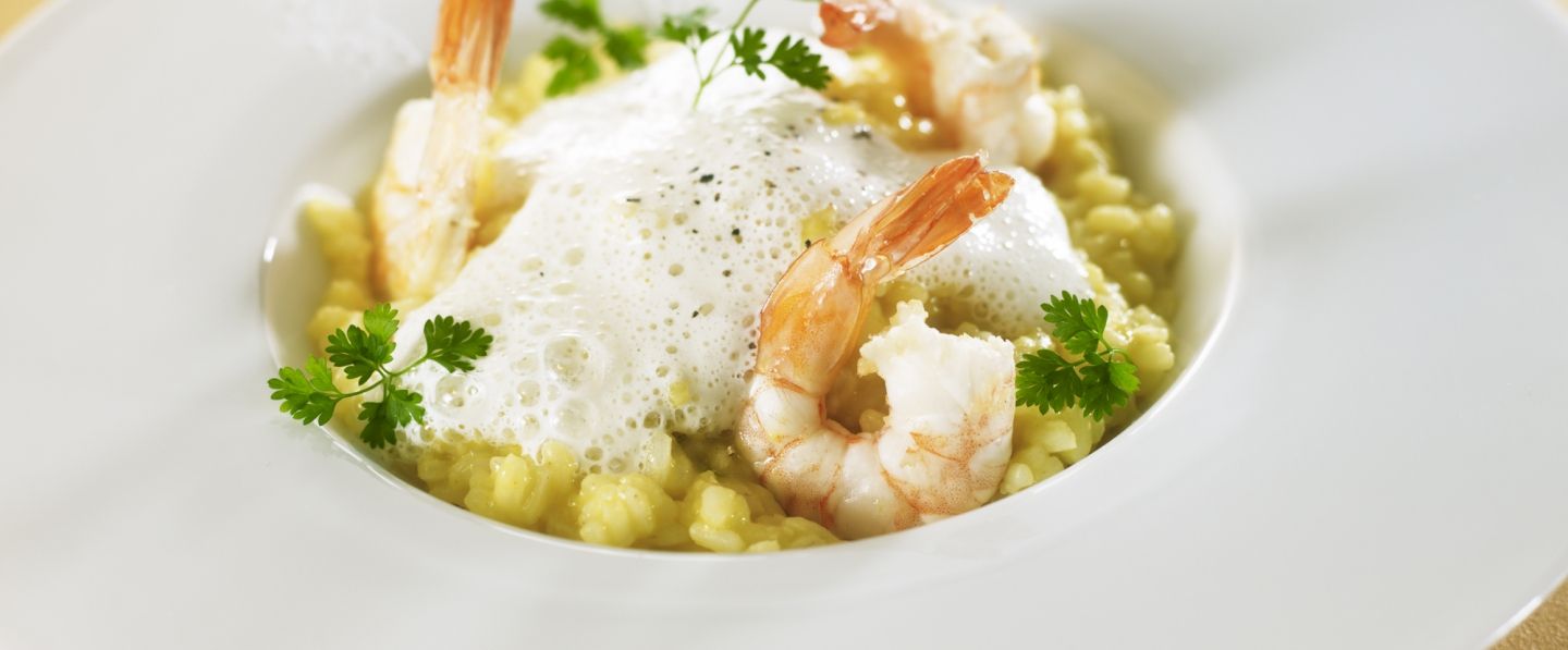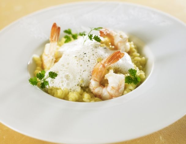 Dresser le risotto, terminer avec la sauce émulsionnée.