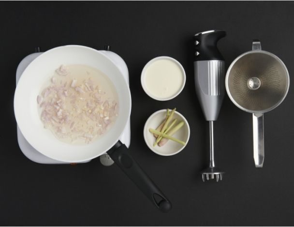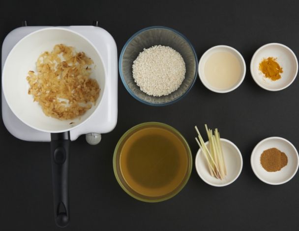 Déglacer avec le vin blanc, laisser réduire. Verser le bouillon de volaille au fur et à mesure. Rajouter les bâtons de citronnelles, le curry et curcuma. Mouiller le riz lorsqu’il commence à se dessécher.