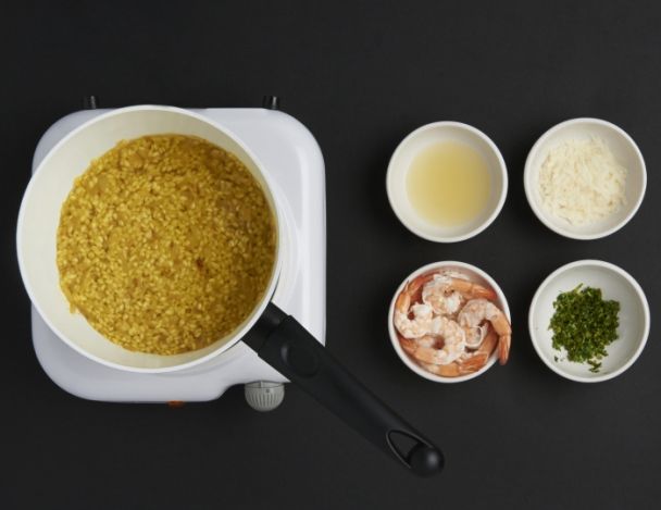Incorporer les crevettes roses, la coriandre hachée, le jus de citron. Lier le risotto avec le parmesan en poudre, rectifier l’assaisonnement.