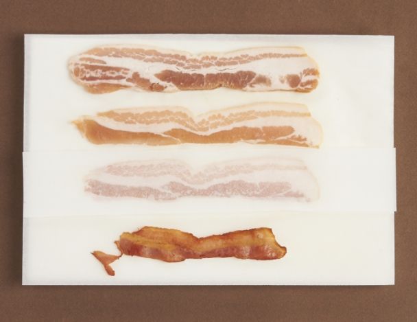 Placer le lard au congélateur pour le rendre bien dur cela facilitera la coupe. Couper de fines lames de lard a la trancheuse à jambon. Sur une plaque de cuisson placer les fines tranches de lard entre deux silpat (ou papier cuisson). Couvrir d’une deuxième plaque de cuisson. Mettre au four a 180°C pendant 5 à 8 minutes. Retirer du four, et garder les bandes de lard croustillant dans un endroit tiède et sec.
