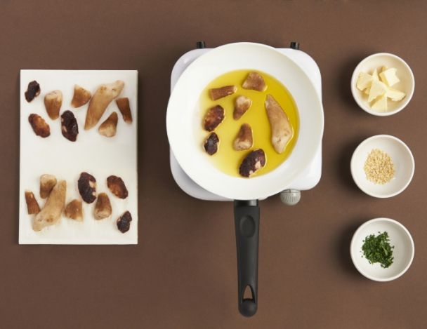 Gratter et parer les pieds des cèpes, les nettoyer avec un torchon humide. Couper les cèpes de haut en bas en quatre ou six tout dépend de la taille du champignon. Placer les cèpes sur une plaque de four et les cuire 10 minutes a 170°C. Les sortir du four et les égoutter. Faire sauter les cèpes dans une poêle chaude avec de l’huile d’olive. Rajouter le beurre en milieu de cuisson, saler et poivrer. Finir la cuisson des cèpes avec l’ail et le persil haché.