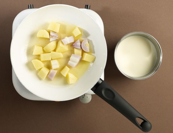 Tailler les pommes de terre et les échalotes en cubes de taille régulière. Faire fondre le beurre et y incorporer les échalotes et les pommes de terre.