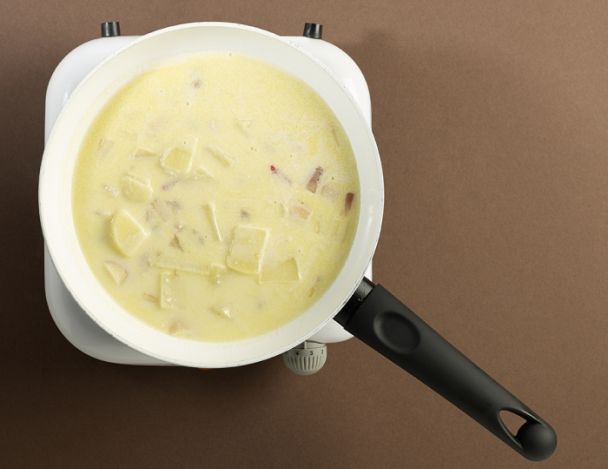 Remuer quelques minutes et incorporer le bouillon jusqu'à obtention d'une pomme de terre cuite et ferme.