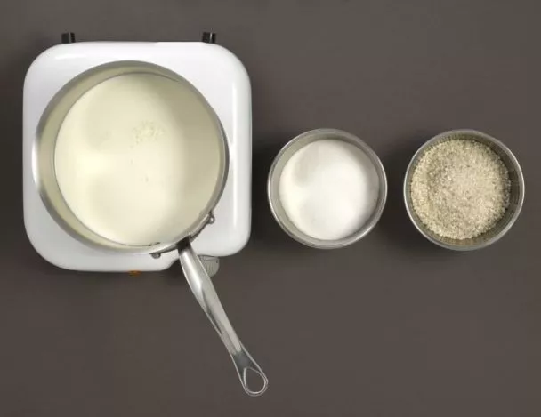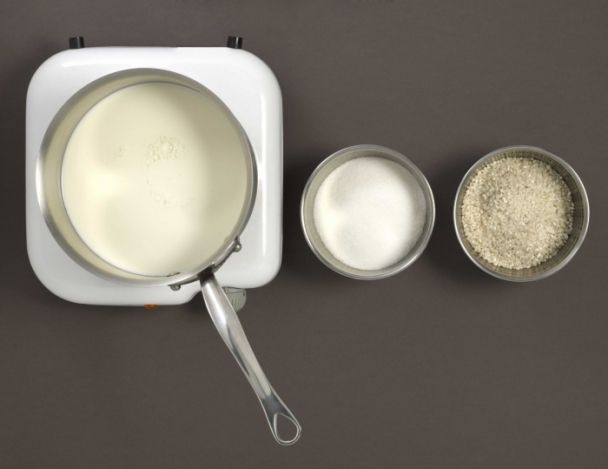 MoyenRincer le riz dans une grande passoire, sous l’eau chaude du robinet, puis égoutter. Rincer et réserver. Dans une casserole à fond épais, porter le lait à frémissement avec le sel. Ajouter les 160g de sucre en pluie. Remettre le feu, verser le riz en pluie et laisser cuire le riz dans le lait frémissant. À frémissement baisser le feu sous la casserole au minimum et couvrir en laissant une petite ouverture.
