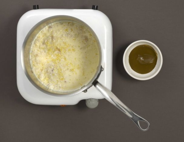 Zester le demi citron et incorporer au riz qui cuit. Cuire 30 minutes environ, en tournant toutes les 10 minutes. Après cuisson, incorporer au riz chaud hors du feu la pâte de pistache.