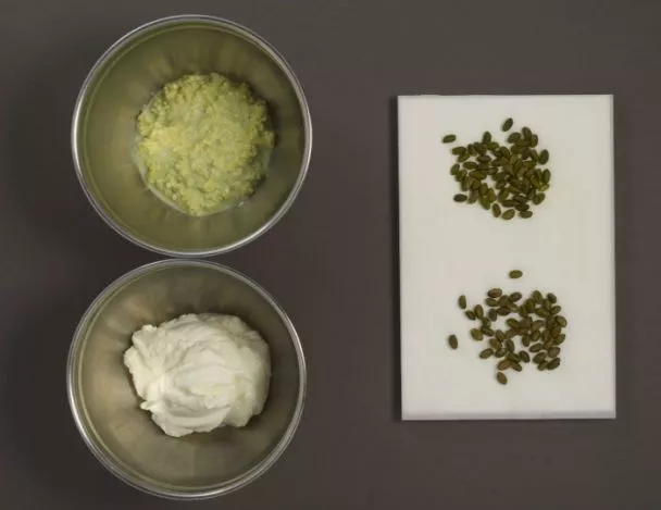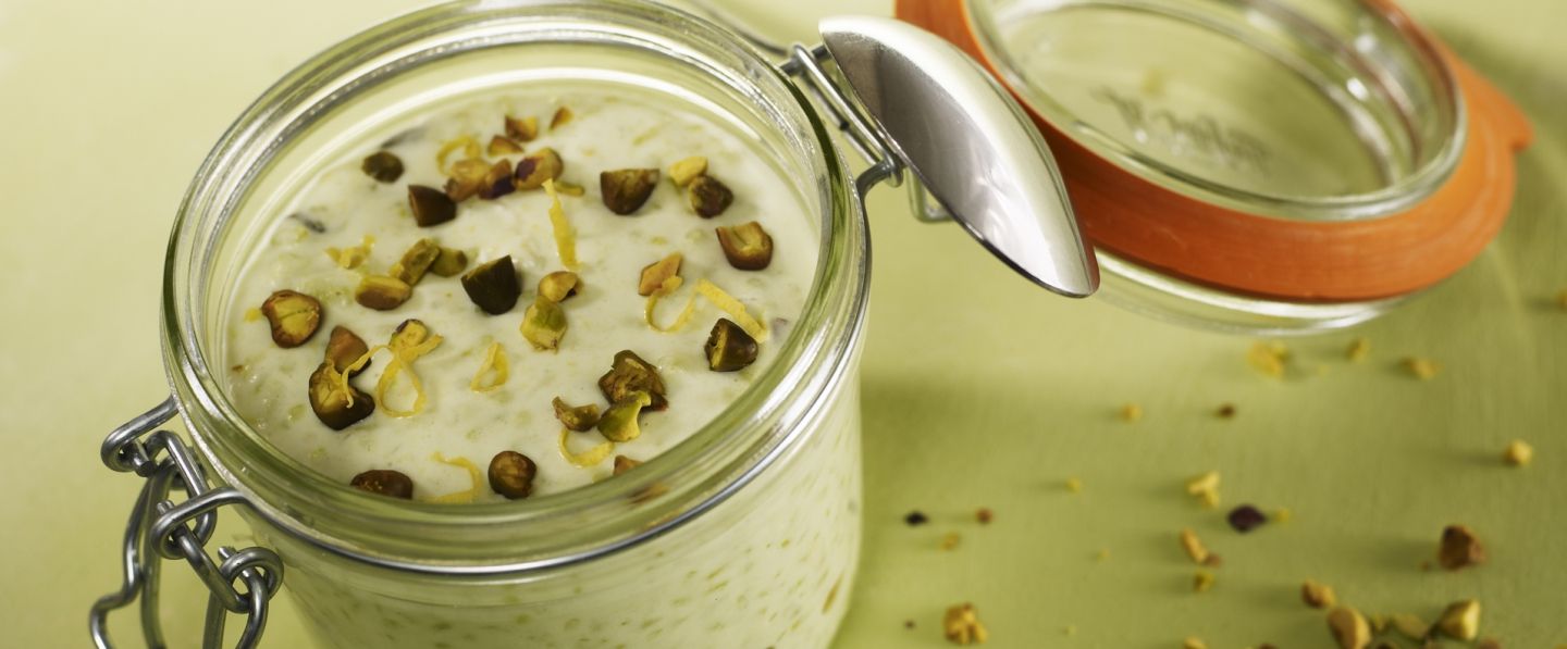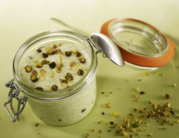 Incorporer les 2/3 des pistaches au riz avant de dresser en bocaux. Décorer les dessus des bocaux avec le tiers de pistaches grillées restantes.