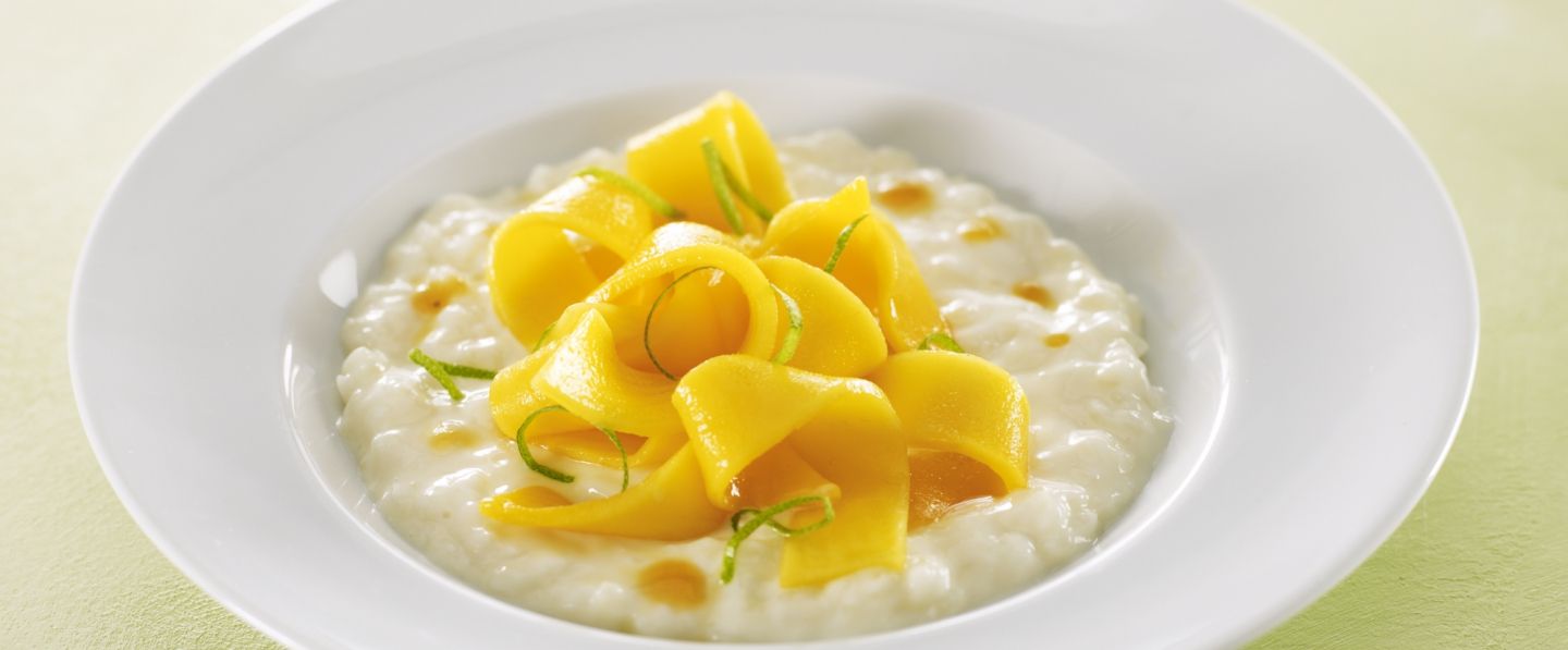 Eplucher les mangues bien mûres. A l'aide d'un économe, faire des lamelles de mangues pour le dressage. Et Réserver.