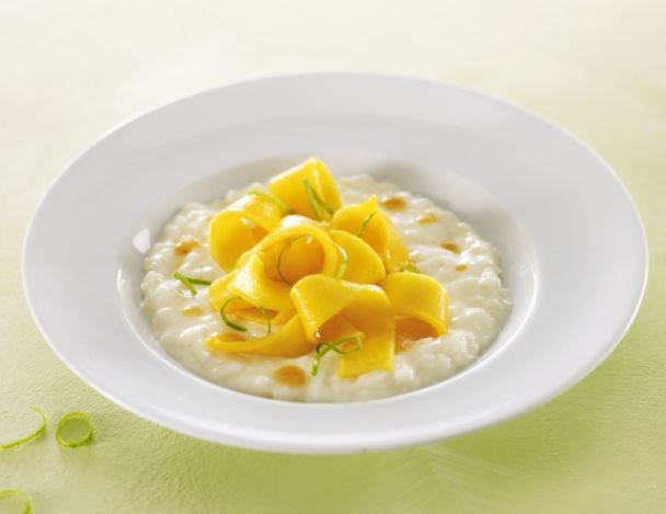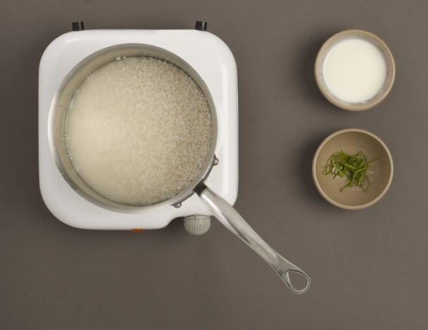 Egoutter. Remettre le riz dans la casserole et le cuire avec le lait et le zeste de citron vert. Cuire jusqu'à évaporation totale du lait.