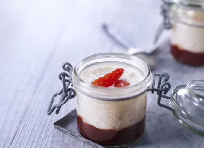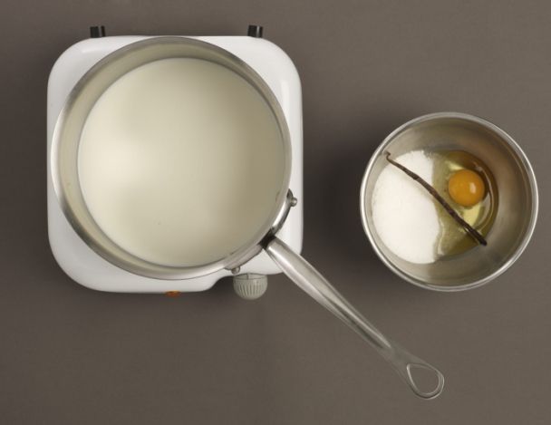 A part, préparer une crème anglaise. Mélanger le sucre avec les jaunes d'œuf et la vanille. Faire bouillir le lait et ajouter. Remettre dans la casserole et cuire à 85°C. Verser la crème anglaise dans des assiettes creuses et mettre au frais.