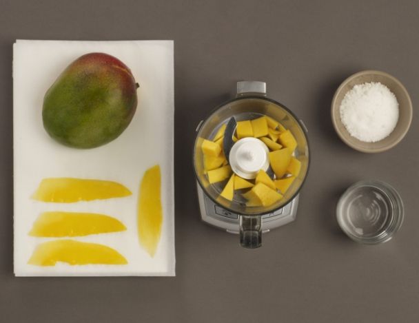 Avec le restant de mangue, réaliser un coulis. Mixer les morceaux de mangue avec un peu d'eau et de sucre.
