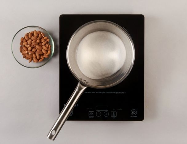 MoyenCaraméliser le sucre et verser les amandes. Griller les amandes à cœur avec le caramel.