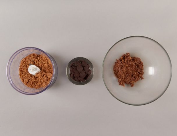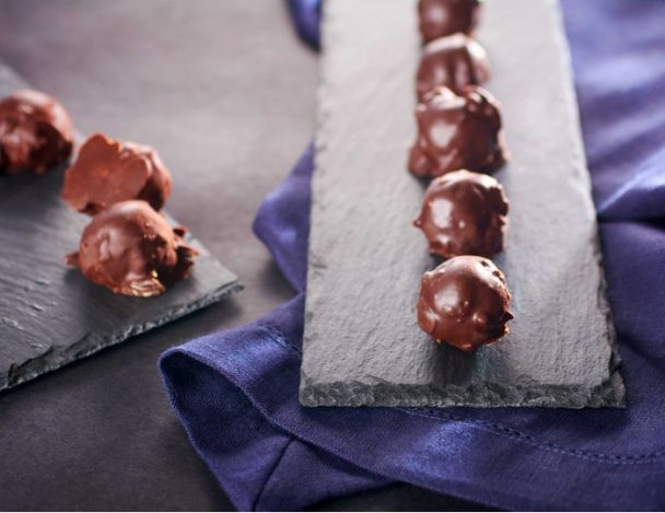 Passer au mixeur et en faire une pâte. Puis incorporer dedans 120 g de chocolat noir. Laisser refroidir. Former en boules.