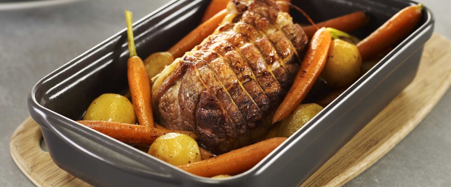 À mi-cuisson, couper les fanes des oignons et des carottes, les grenailles en deux et les ajouter autour du rôti.