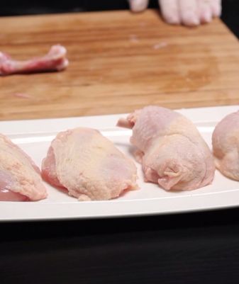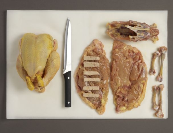 MoyenDésosser complètement le poulet. Sur chaque moitié, saler et poivrer.
