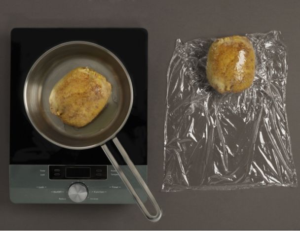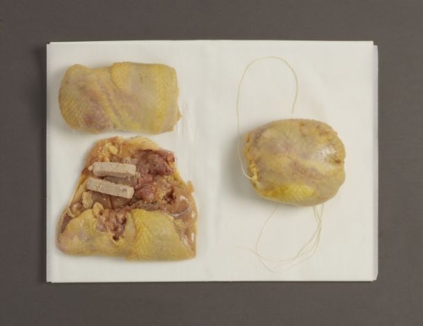 Refermer et coudre la peau du poulet pour former deux ballotins.