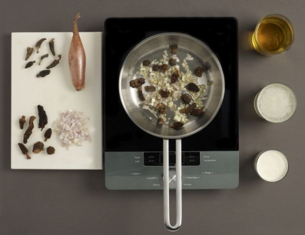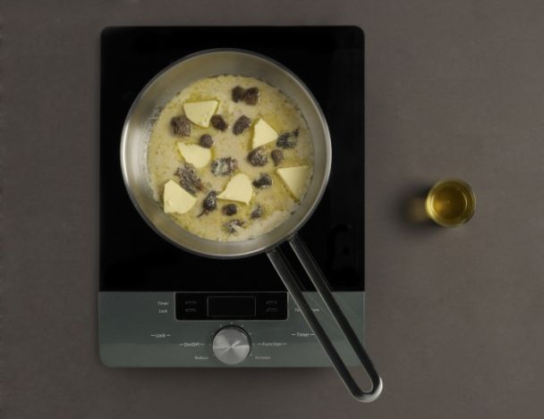 Ciseler l'échalote et la faire suer avec les morilles dans 20g de beurre. Mouiller avec 2dl de vin Jaune.