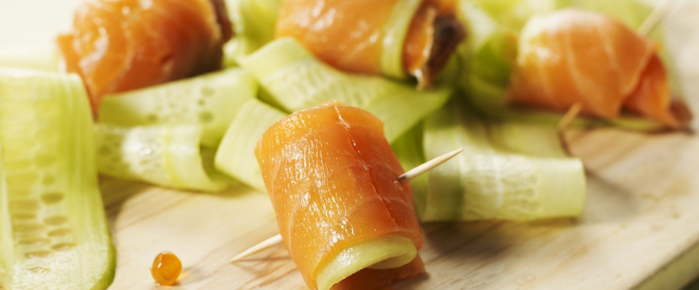 Poser une lamelle de saumon à plat, ajouter une lamelle de concombre, puis une de saumon, tartiner finement de crème au raifort, ajouter quelques œufs de saumon à une extrémité. Enrouler le tout et fermer avec un pic. Répéter l'opération avec le reste des ingrédients. Réservez au frais jusqu'au moment de senvir.