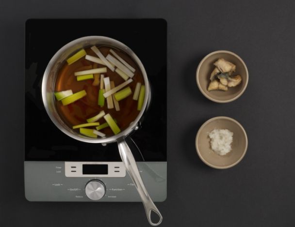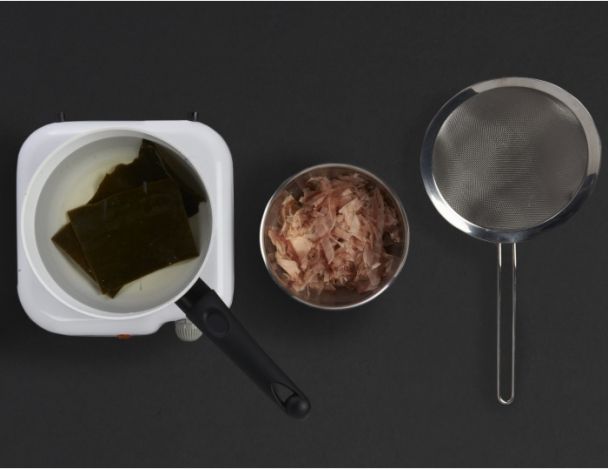 MoyenFaire chauffer à feu moyen l’eau et le konbu. A ébullition, enlever le konbu. Jeter dans l’eau bouillante la bonite séchée. Attendre à petit feu 15 secondes si la bonite est en copeaux, ou 20 mn si l'épaisseur des morceaux de bonite est de 1-2 mm. Passer au chinois très fin. Réserver