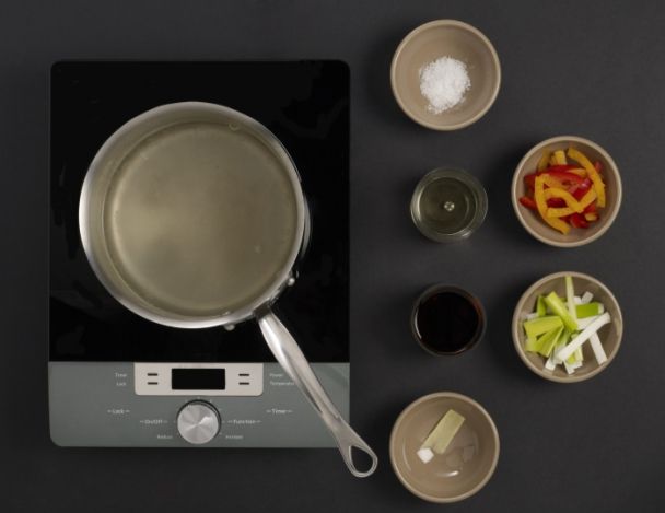 Emincer les poivrons. Dans une casserole mettre le dashi, le mirin, la sauce soja, le sel et le gingembre. Porter a ébullition. Ajouter les poivrons. Cuire pendant 2 mn, ajouter le poireau