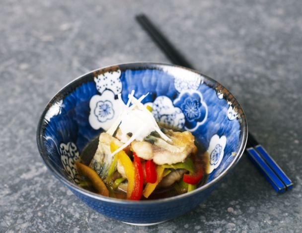 Dresser dans des assiettes creuse. Pour la décoration, ciseler de la ciboulette japonaise et râper un peu de navet.
